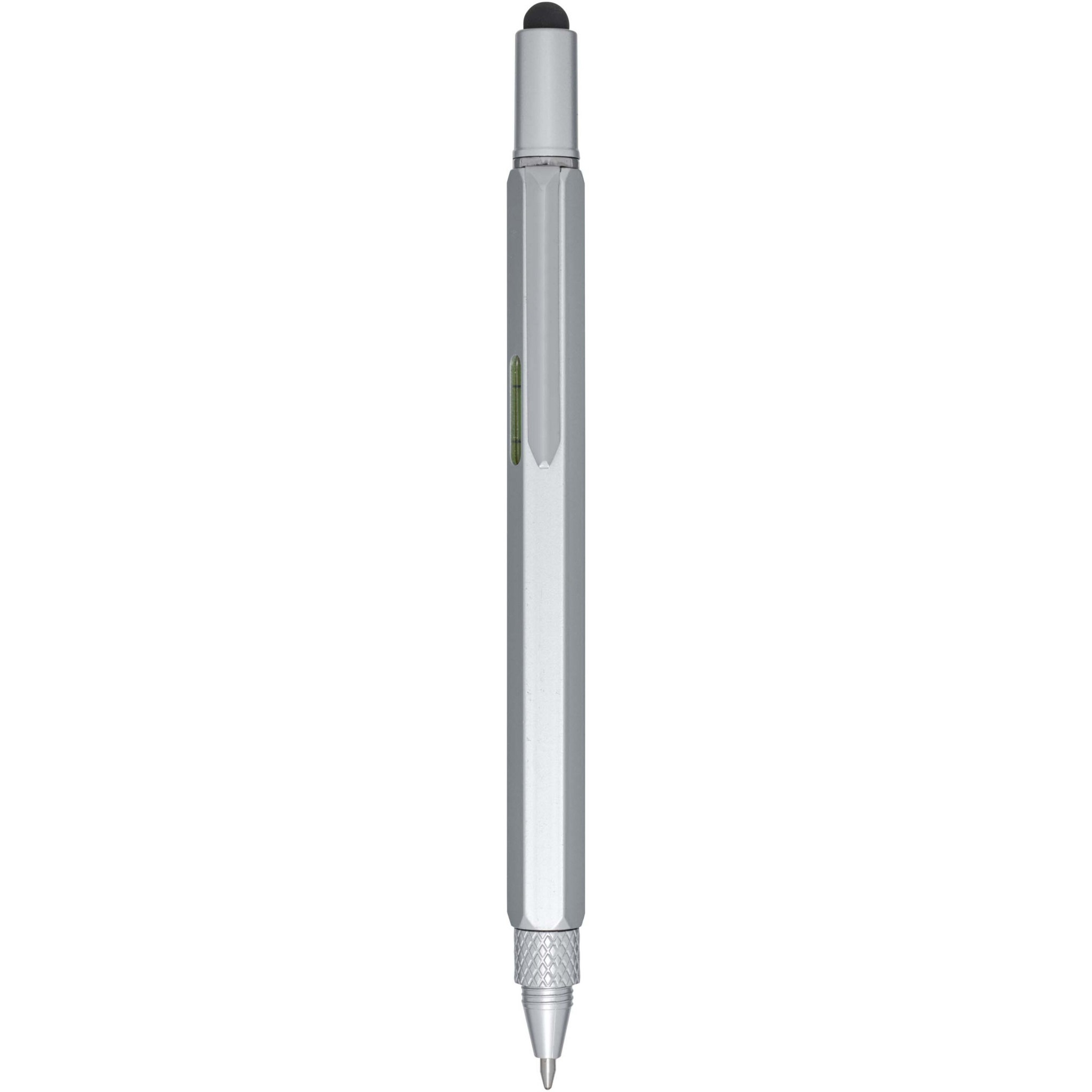 Der Dora Multifunktionskugelschreiber aus Aluminium besteht teilweise aus recyceltem Material und ist mit einem doppelseitigen Lineal, einer Wasserwaage, einem Schraubendreher, einem Neigungsmesser und einem schwarzen Stylus aus Gummi ausgestattet. Der Schaft besteht aus recyceltem Aluminium mit einer silbernen Sprühbeschichtung. Der Clip besteht aus Eisen. Der Schraubenzieher ist aus Stahl. Der obere Teil und die Spitze sind aus RABS gefertigt. Tintenfarbe: Schwarz. Schreiblänge: 400 Meter. Strichstärke: 1,0 mm.