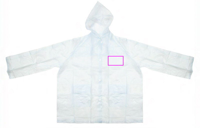 PVC-Regenjacke (Einheitsgröße XL) transparent gefrostet mit Kapuze, zwei Fronttaschen und Druckknöpfen. Ihre Werbung drucken wir auf die Brust (Herzseite).