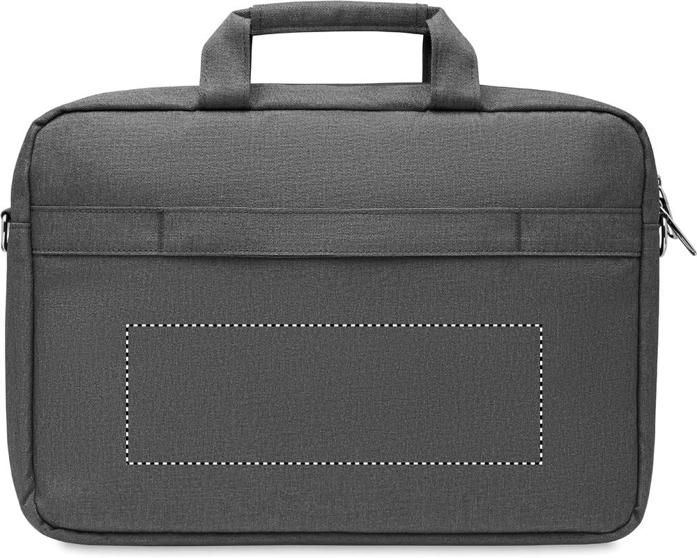 15 inch laptop bag in 600D RPET polyester. 2 main internal compartments for both laptop as tablet and large zippered front pocket. It has a small zippered pocket. Detachable and adjustable shoulder straps. Trolley holder on reverse side.