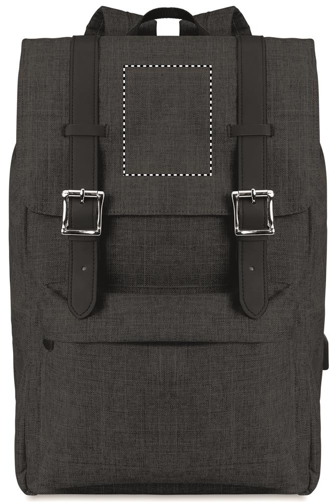Laptop backpack in 600D 2 tone polyester with padded shoulder strap including one main internal compartment for 15 inch laptop and a USB charging cable. Includes magnetic snap button closure and one zippered front compartment.