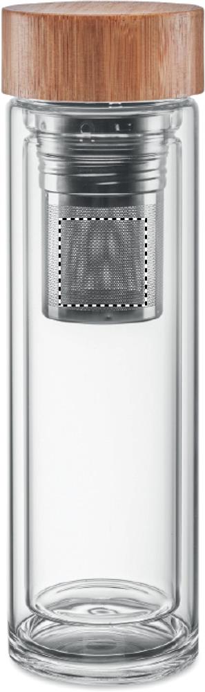 Double wall in high borosilicate glass bottle and bamboo lid with tea infuser. Capacity: 400 ml. Bamboo is a natural product, there may be slight variations in colour and size per item, which can affect the final decoration outcome. Leak free. Laser engraving is not possible on borosilicate glass.