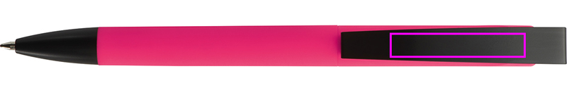 Plastic ballpen with rubber finish and blue-writing refill. We engrave your logo on the metal clip.