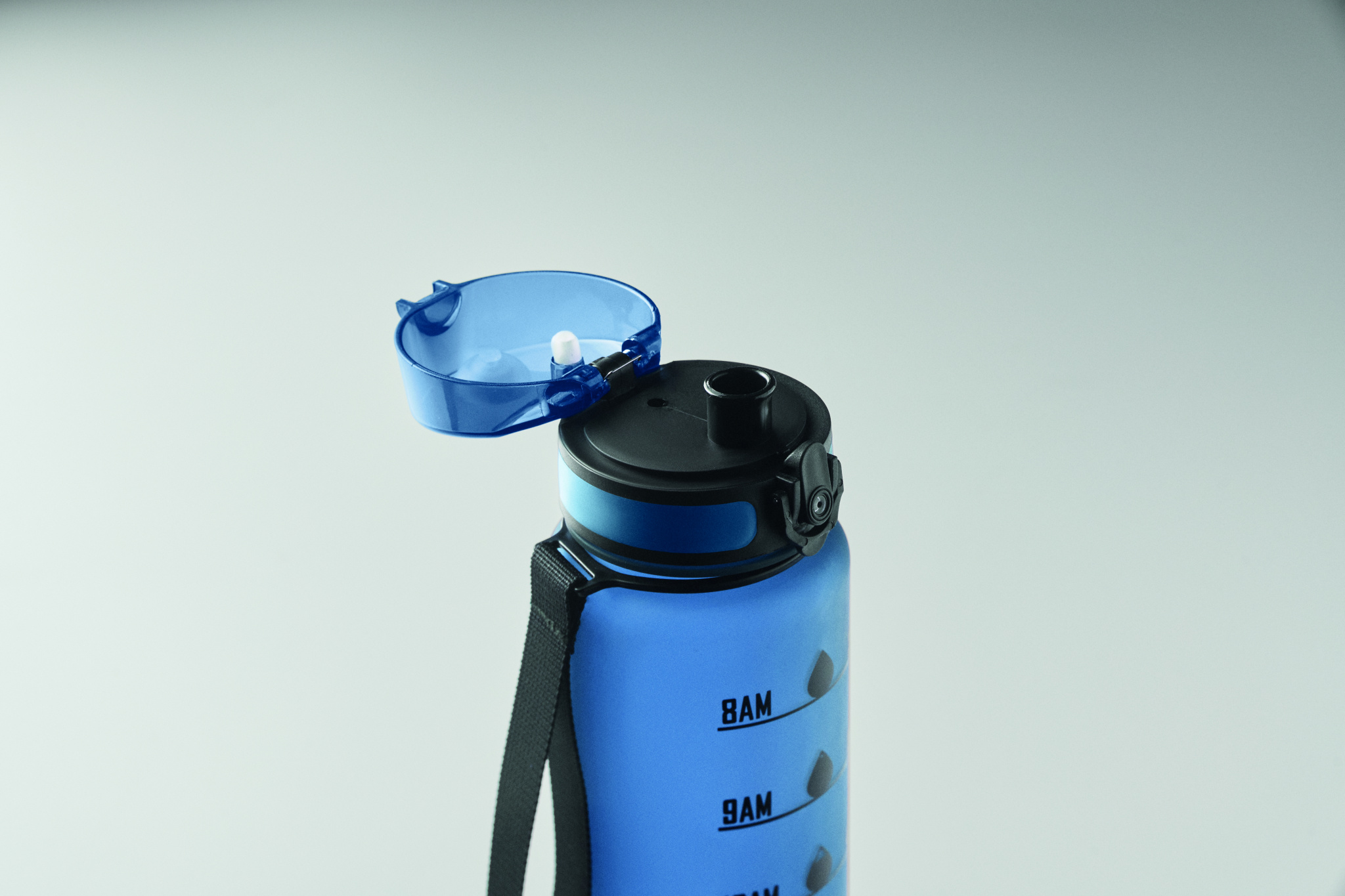 Sports water bottle in RPET, motivational time markings, one hand opening flip top lid, safety lock and carrying strap. Leak-free. Capacity: 1L.