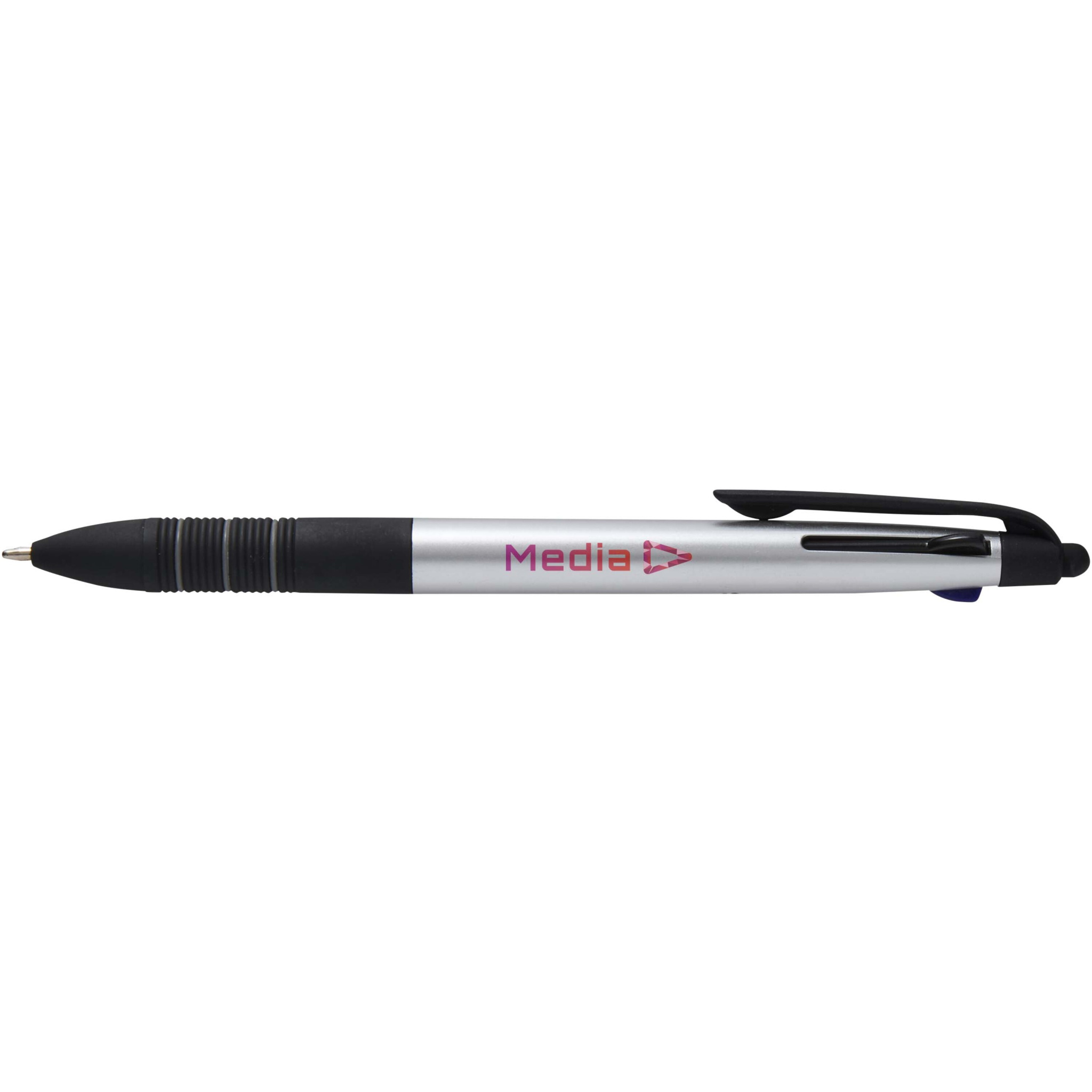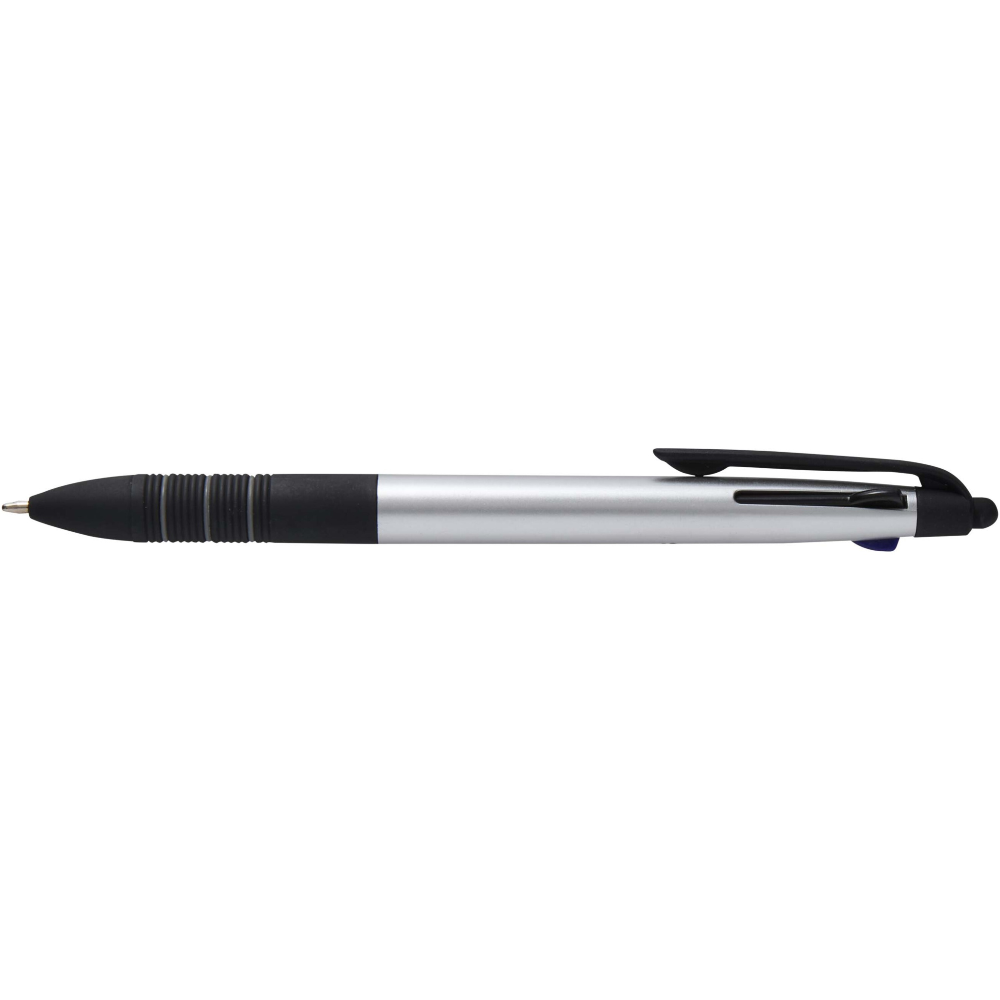 The Trine 3-in-1 ballpoint pen is a versatile writing tool made from RCS certified ABS plastic with a modern metallic finish and an integrated stylus tip for touchscreen use. It features a push-slide mechanism to easily switch between black, blue, and red ink. The ergonomic grip with black anti-slip rubber and grey ring details ensures comfortable handling. Compact, functional, and ideal for branding, the Trine pen is perfect for note-taking, presentations, or digital interactions.