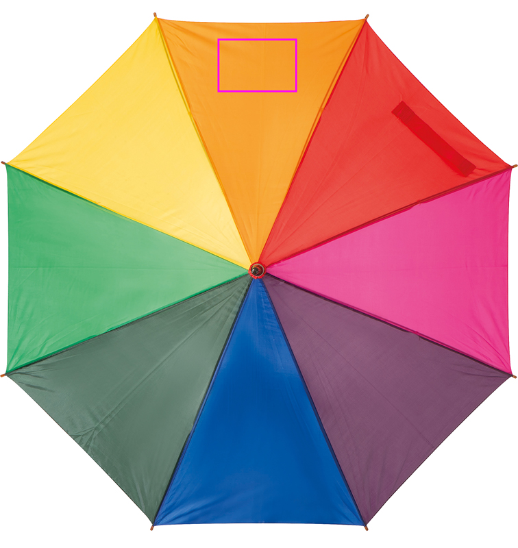 Attractive, multicolor automatic umbrella with curved wooden handle. We print your logo on a segment.