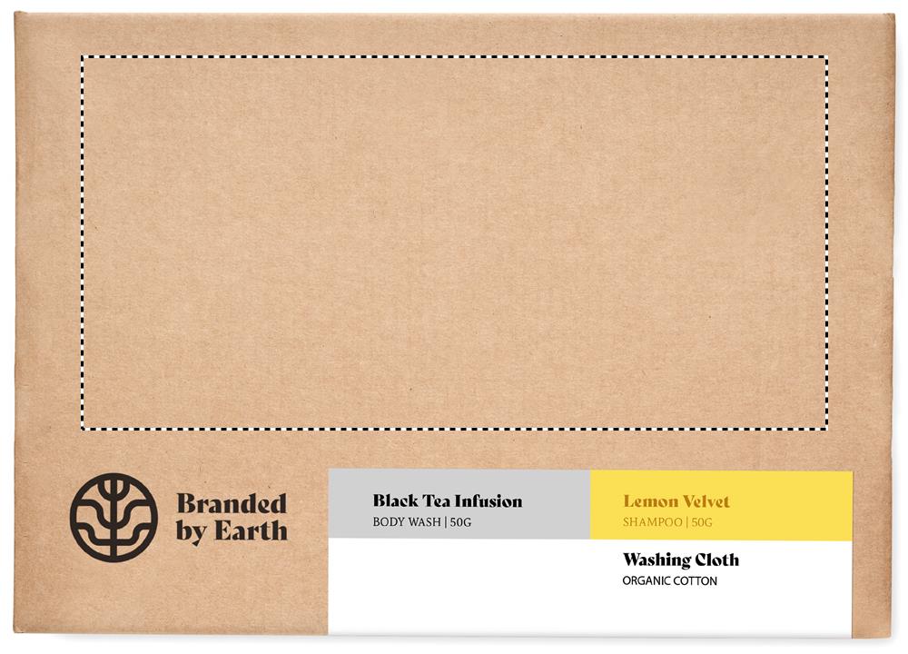 Unisex On the Go gift set by Branded By Earth. Includes 24 vegan 4gr of body wash, shampoo and a washing cloth in organic cotton. All pieces packed in tube. Presented in recycled paper box. Made in EU.