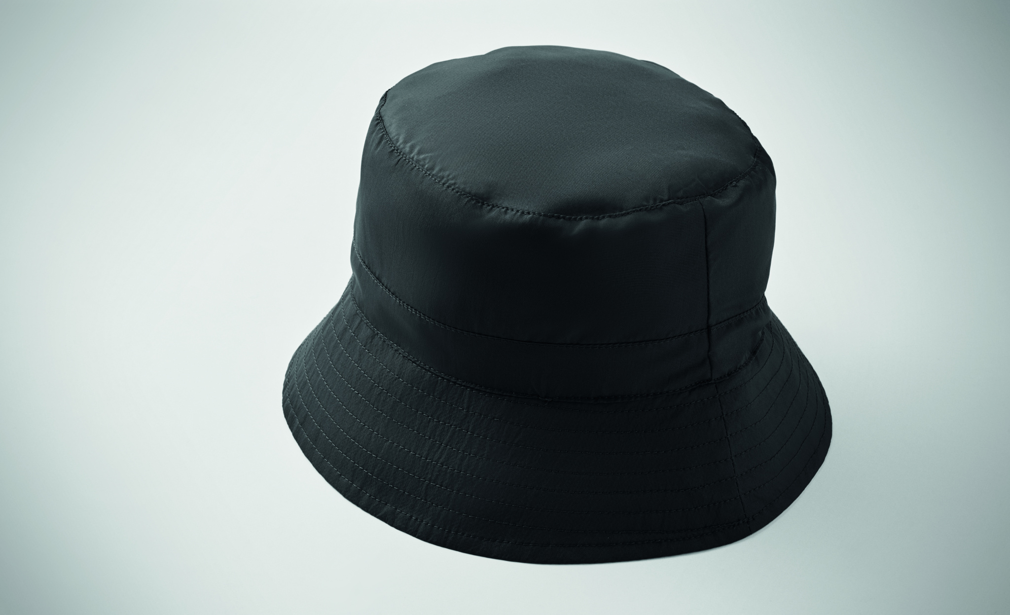 Water repellent fisherman hat made of polyester, includes self material pouch with ABS carabiner. 64 gr/m².