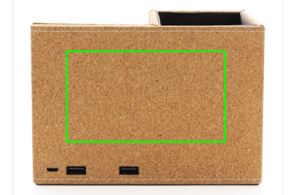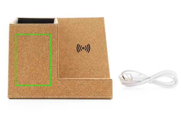 5 W juhtmevaba laadija alus koos naturaalsest korgist valmistatud pliiatsihoidjaga. 150 cm nisukõrrega (15%) segatuna micro tpe kaabliga. Ühildub kõigi QI-toega seadmetega, nagu Android uusim põlvkond, iPhone 8 ja uuemad. Tagaküljel on kaks USB A väljundporti kaabliga laadimiseks. Sisend: 5V/2A; Juhtmeta väljund: 5/1A - 5W. 2x USB väljund 5V/2A; Toode ja tarvikud 100% PVC-vaba.