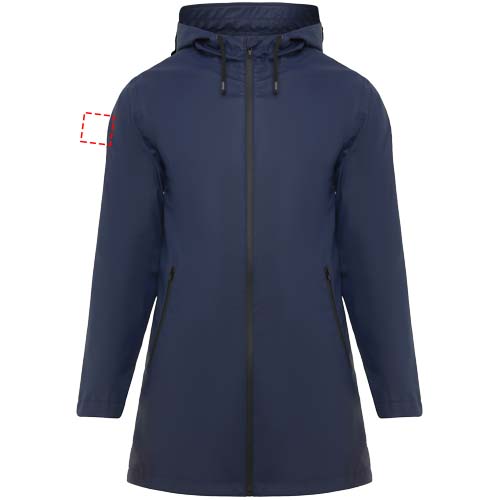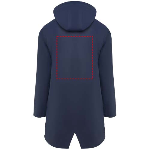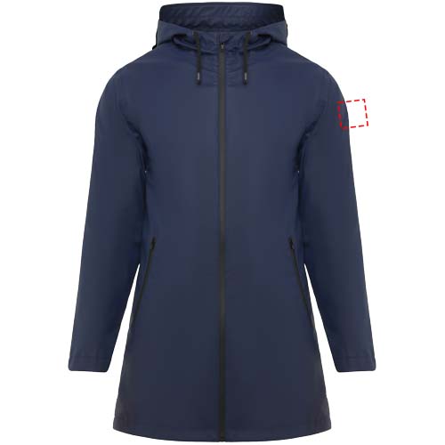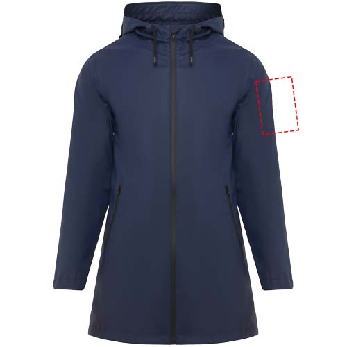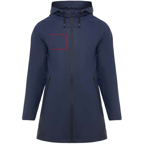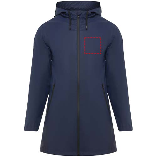 Veekindel vihmamantel naistele. Kapuuts tipuga. Kuumkinnitusega lukud ja õmblused. Must kontrastsed detailid. Kaks lukuga küljetaskut. Tagaäärel lõhik. Eemaldatav etikett. Veekindel. Modell on 179 cm pikk ja kannab suurust S.