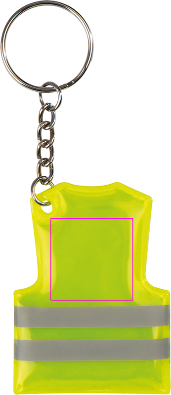 Turvaliivin muotoinen avaimenperä heijastavilla raidoilla. Painamme logosi raitojen yläpuolelle.