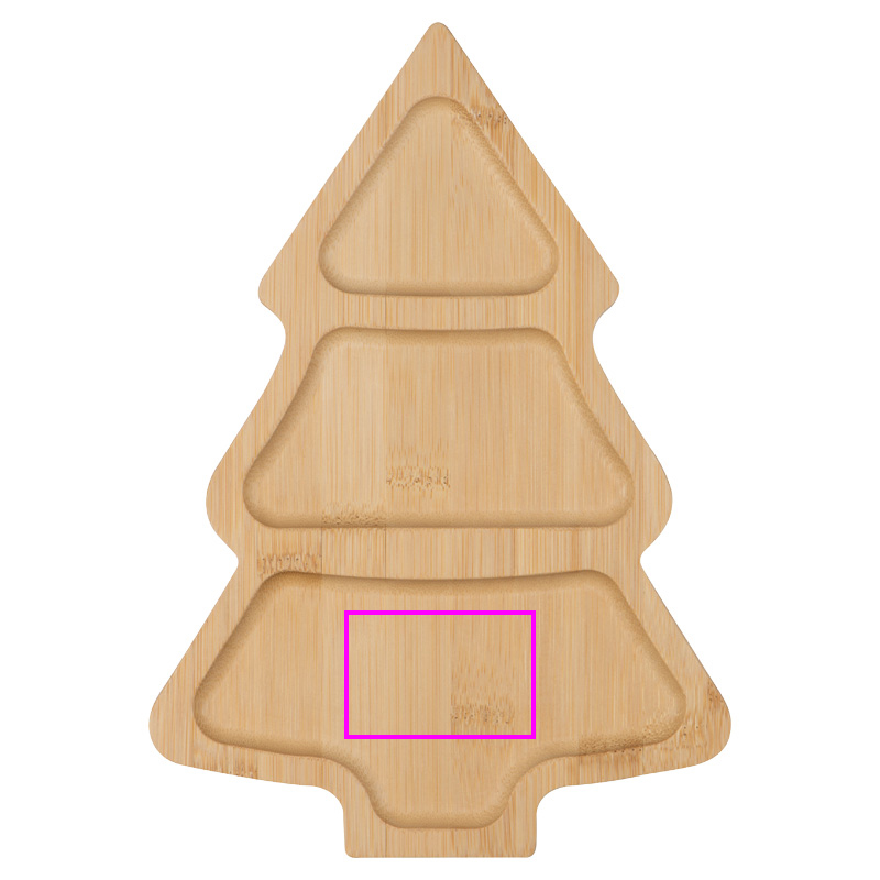 Bambuinen joulukuusen muotoinen välipalatarjotin, jossa on kolme lokeroa. Erittäin mukava koristeellinen asuste adventti- ja jouluaikaan. Logosi kaiverretaan yhteen lokeroista.
