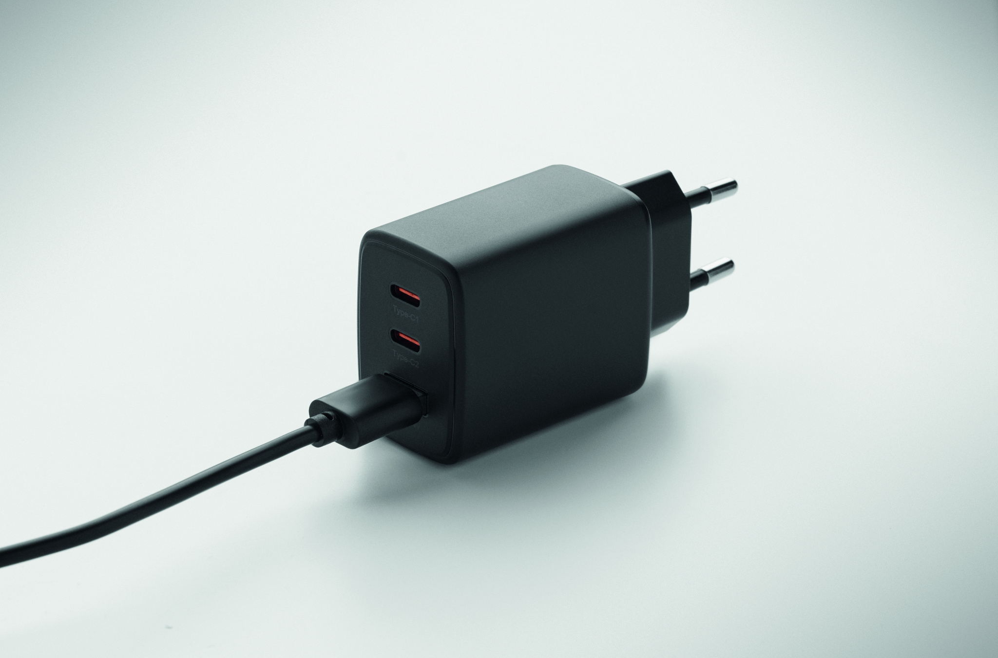 EU:n 2-napainen GaN-seinälaturi, jossa 65 W:n pikalataus, yksi USB-A- ja kaksi Type-C-porttia. Tukee Power Delivery -tekniikkaa.