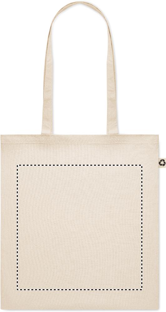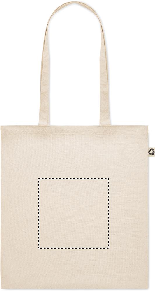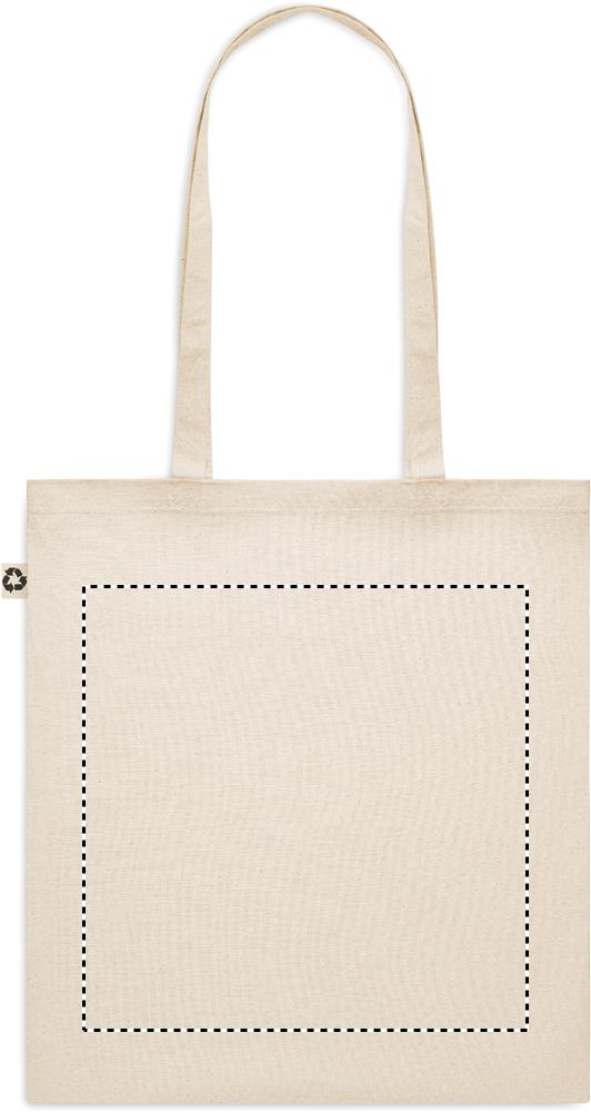 140 gr/m² kierrätetystä puuvillasta valmistettu kassi (65 % kierrätettyä puuvillaa, 35 % tavallista puuvillaa), pitkillä kahvoilla.