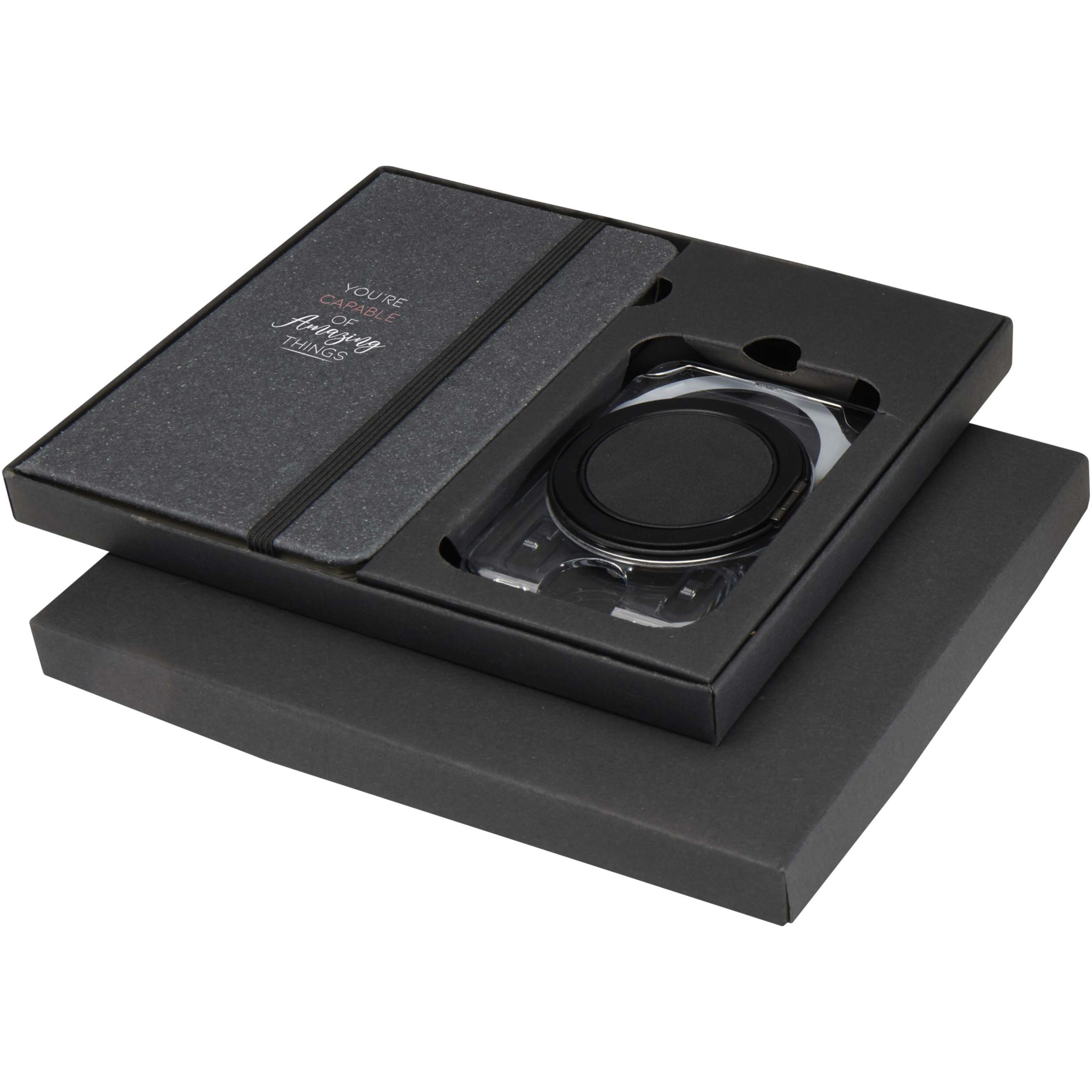 Käytännöllinen lahjasetti, joka sisältää A6-muistikirjan ja MagSafe-lompakon. Muistikirjassa on tummanharmaa kierrätysmuovista valmistettu kansi, 80 viivoitettua, kermanväristä 70 g/m²:n paperiarkkia ja musta kuminauhasuljin. Läpinäkyvään MagSafe-lompakkoon mahtuu yksi kortti, ja se kiinnittyy magneettisesti iPhone 12:een tai uudempiin malleihin. Mukana tulee myös ylimääräinen metallirengas muiden puhelimien kanssa käytettäväksi. Molemmat tuotteet toimitetaan tyylikkäässä mustassa kartonkilaatikossa.