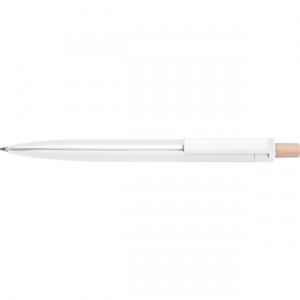 Kierrätetystä ABS-muovista valmistettu kuulakärkikynä, jossa on bambuinen painike. Siinä on sinisellä kirjoitettava muovinen täyttöpakkaus. Logosi on painettu rungon päälle klipsin alle.