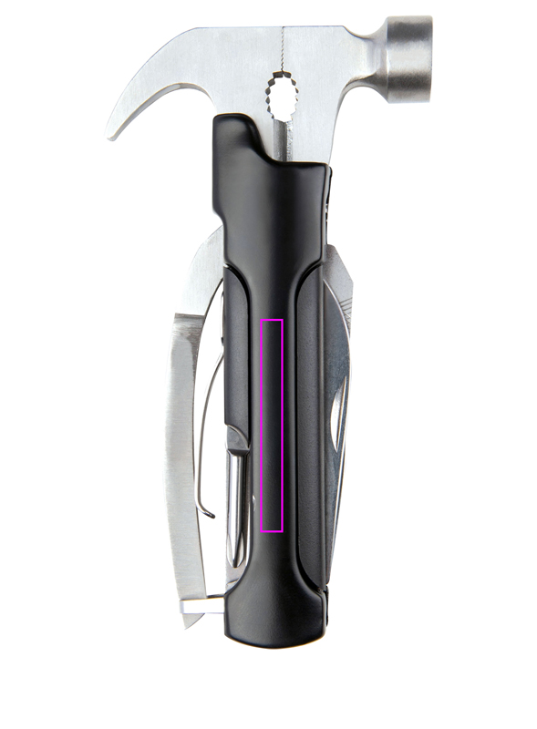 Monitoimityökalu (ruostumaton teräs), joka koostuu vasarasta, viilasta, kahdesta terästä, sahasta, uraruuvitaltasta ja pullonavaajasta. Mukana on yhteensopiva kotelo, jonka keskelle painamme logosi.