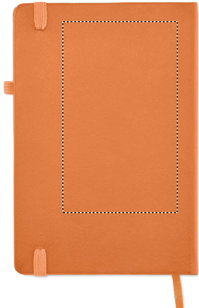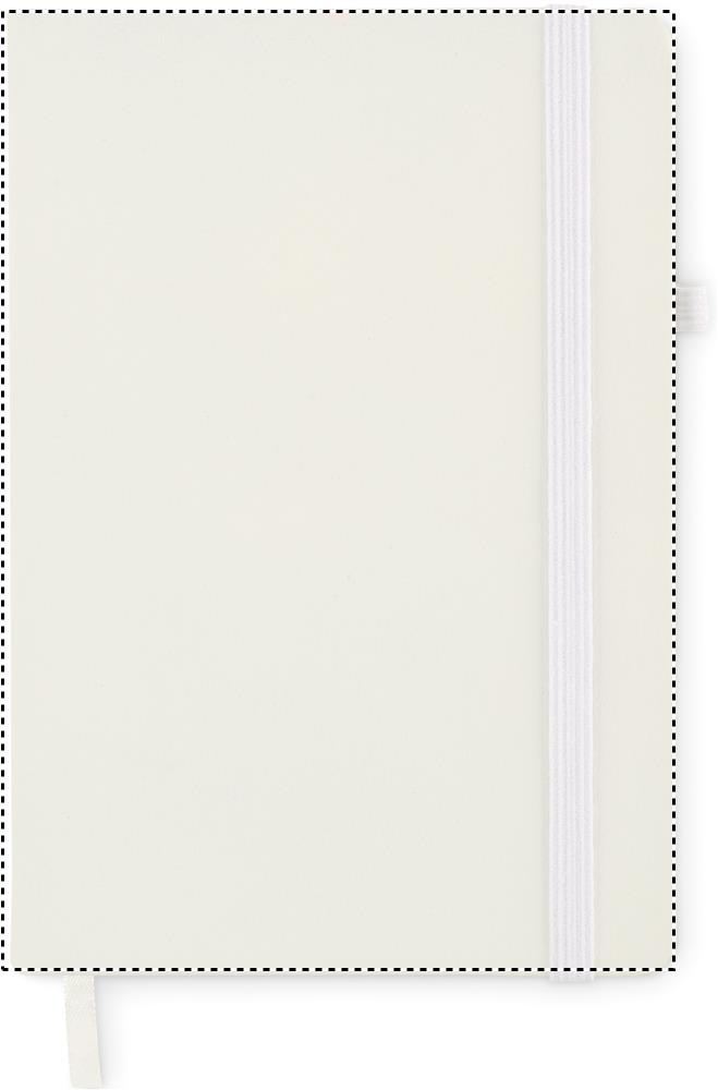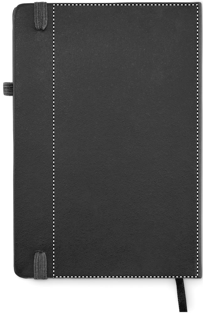 A5 muistikirja jonka kannet on kierrätettyä PU materiaalia. 192 viivoitettua sivua kierrätyspaperista (96 arkkia). Kiinnitys kuminauhalla, kirjanmerkki ja kynäpidike kuminauhasta.