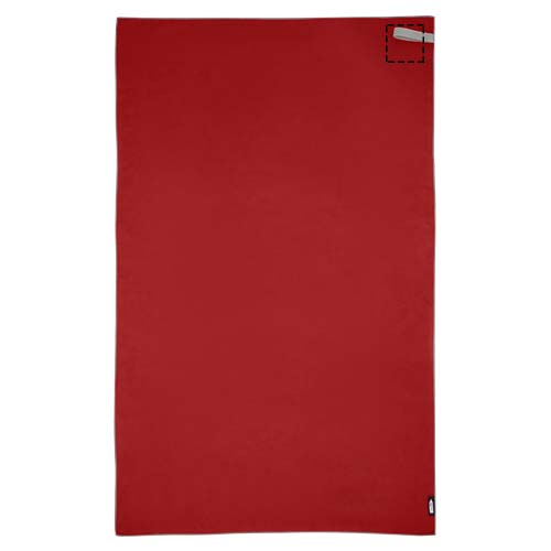 Tämä urheilupyyhe imee kosteutta erittäin hyvin, on kevyt ja kuivuu nopeasti. Lisäksi kangas on kestävää ja erittäin pehmeää. Kun pyyhe taitellaan ja kiinnitetään joustavalla nauhalla, se pienenee, mikä tekee siitä sopivan kuntosalille, uima-altaalle, patikointiin tai retkeilyyn. Pyyhkeen koko on 130 x 80 cm, se on valmistettu 200 g/m2 kierrätetystä PET-polyamidista ja se voidaan pestä pesukoneessa 40 °C:ssa. Mukana toimitetaan kierrätetystä PET-muovista valmistettu säilytyspussi (20 x 8,5 cm), jossa on logon painamiseen sopiva alue.