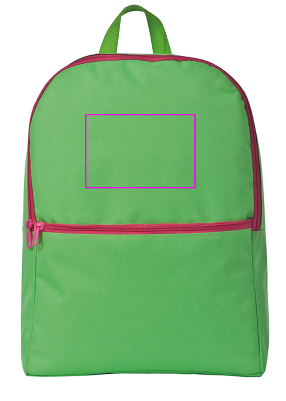 Pitkäkestoinen 600D polyesterista valmistettu reppu kirkkaissa väreissä isolla päälokerolla ja ylimääräisellä etutaskulla. Logosi painetaan etulokeroon.