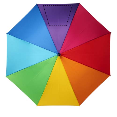 Automaattisesti avautuva sateenvarjo, pongee-polyesterikupu sateenkaaren väreissä. Tukeva metallivarsi ja laadukas runko lasikuituruoteilla toimivat joustavasti tuulessa. Pehmeä, vinokahva ja nikkelöidyt kärjet ja pää. Suuri koristelualue jokaisessa paneelissa tarjoaa erilaisia luovia logoratkaisuja.
