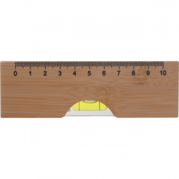 Bambusta valmistettu vatupassi mitta-asteikolla ja pullonavaajalla. Logosi on kiinnitetty vatupassiin laserkaiverruksella.