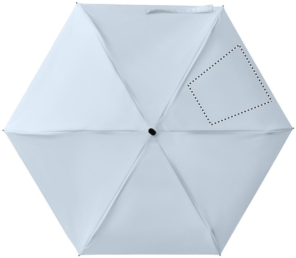 19 colių ilgio, 5 dalių rankinis skėtis, pagamintas iš 190T pongee audinio, su atitinkamu maišeliu. Jis turi metalinį ir stiklo pluošto vėjui atsparų rėmą, juodą gumuotą rankeną su riešo dirželiu, o sulankstytas ilgis – 17 cm.