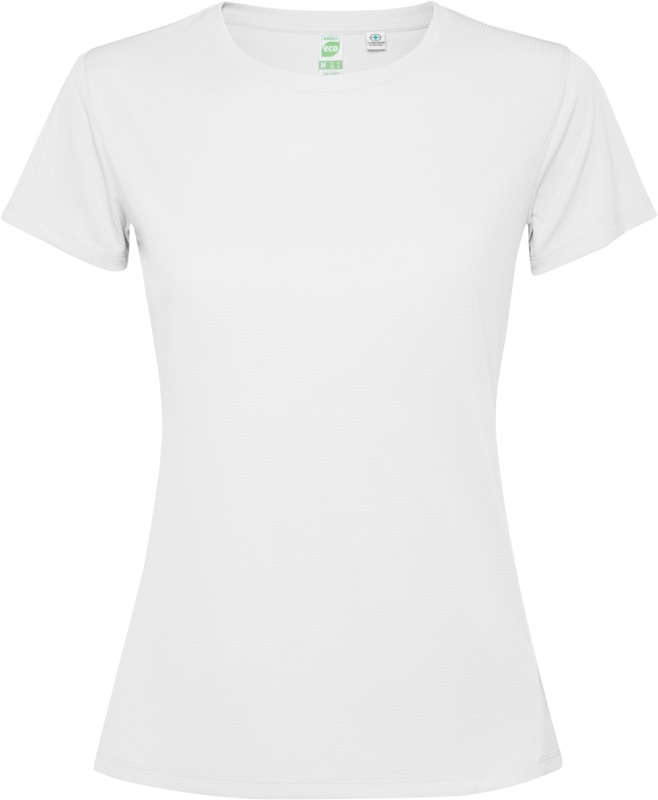 Moteriški techniniai marškinėliai trumpomis rankovėmis. Apykaklė su derančiomis siūlėmis. Nugaros pakraštys kiek ilgesnis nei priekis. Šoninės siūlės pasislinkusios į priekį.