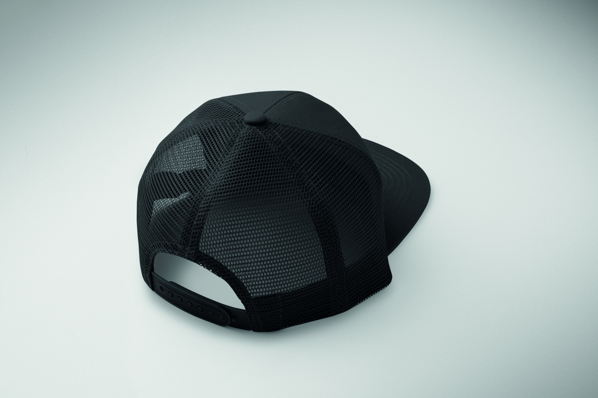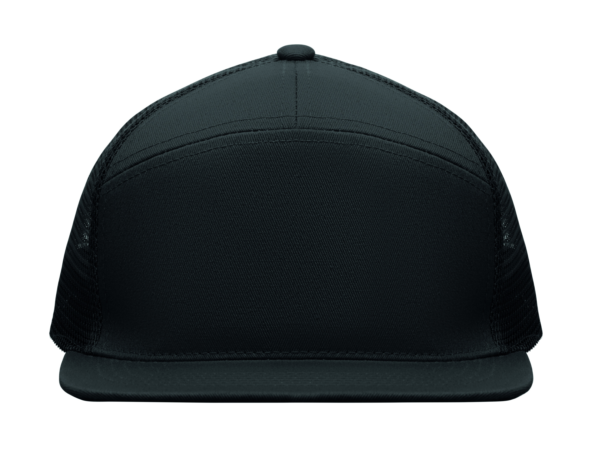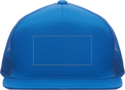 7 panel flat visor cap in cotton twill 235 gr/m² with polyester mesh backside and plastic closure.