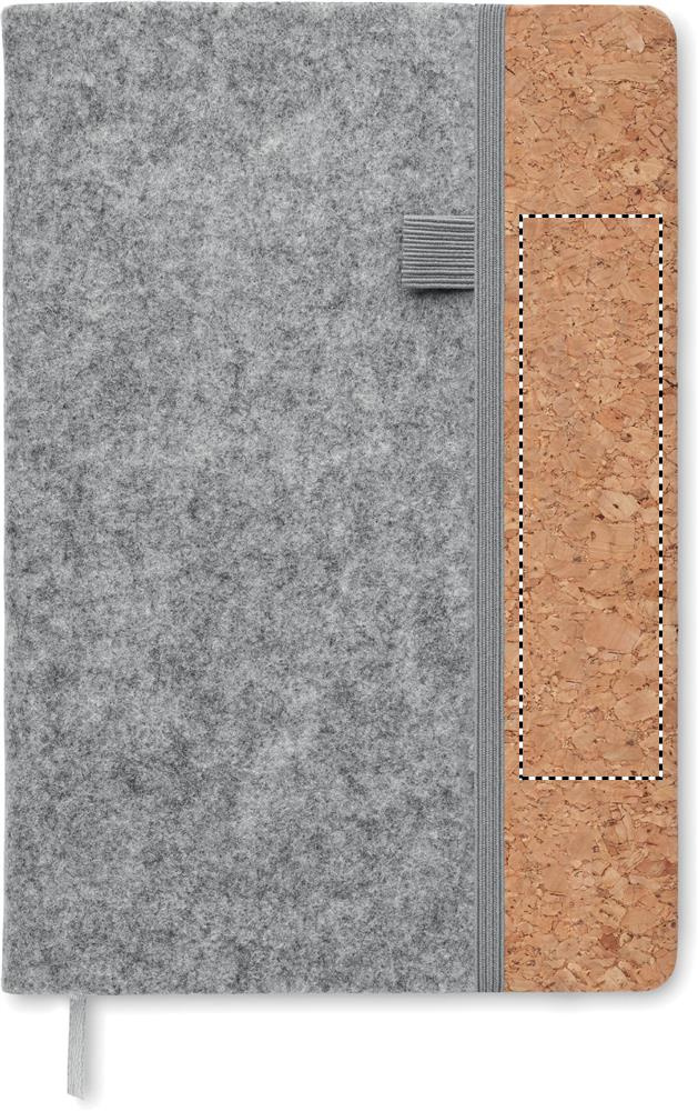 A5 notebook with RPET felt cover and cork. 160 recycled paper lined pages (80 sheets). Elasticated pen loop on front, matching elastic closure strap and ribbon page-marker.