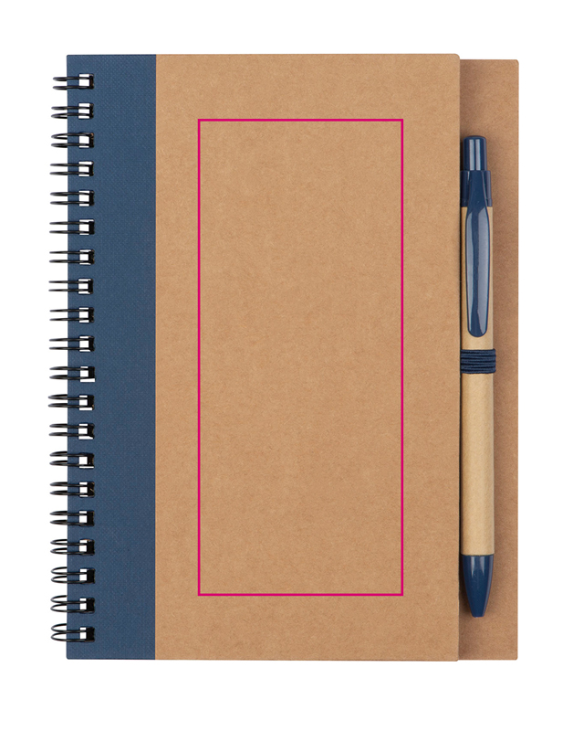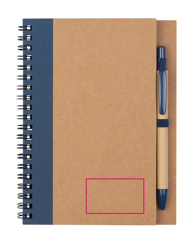 Блокнот на спирали со 120 чистыми страницами из переработанной бумаги (обложка 250 г/м2, страницы 60 г/м2) и петлей для ручки. В комплект входит шариковая ручка из переработанной бумаги с несменным синим стержнем и акцентами из АБС-пластика.
