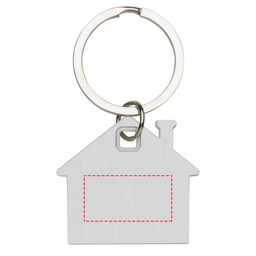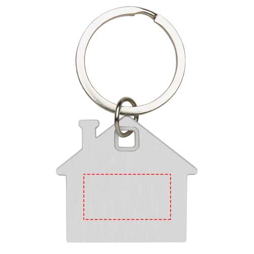 Брелок для ключей в форме домика с пластиной из нержавеющей стали с матовым узором спереди и сзади и цветной пластиковой фишкой посередине.