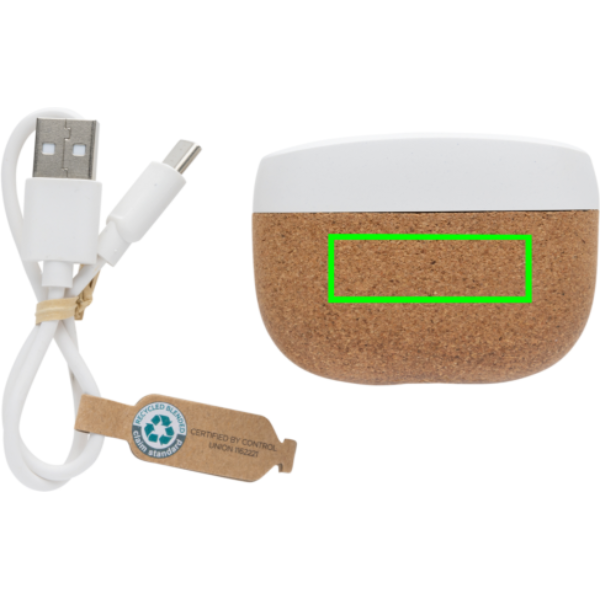 Элегантные беспроводные наушники, изготовленные из 100% пробки FSC® и сертифицированного RCS (Recycled Claim Standard) переработанного АБС. Общее содержание переработанных материалов: 35% от общего веса изделия. Сертификация RCS гарантирует полностью сертифицированную цепочку поставок переработанных материалов. Идеально подходящие наушники имеют аккумулятор емкостью 35 мАч и могут быть перезаряжены в зарядном футляре емкостью 300 мАч в течение 1,5 часов. С функцией автоматического сопряжения, поэтому их легко подключить к мобильному устройству. Время воспроизведения на средней громкости около 3 часов. С BT 5.3 для оптимального соединения. Рабочее расстояние до 10 метров. С датчиком и микрофоном. Включая 3 размера силиконовых амбушюров. Включая сертифицированный RCS переработанный кабель для зарядки TPE. Упакованы в упаковку из крафт-бумаги FSC®. Изделие и аксессуары на 100% не содержат ПВХ.