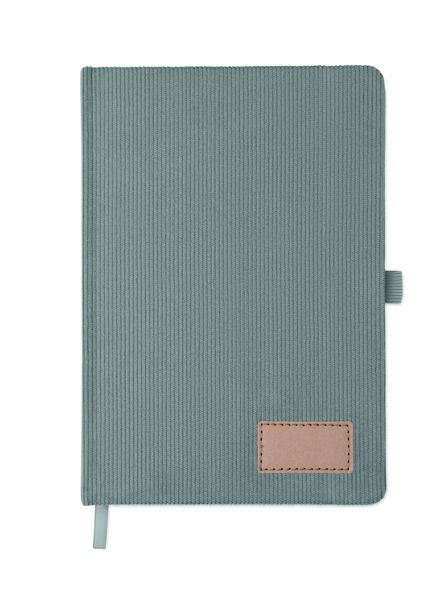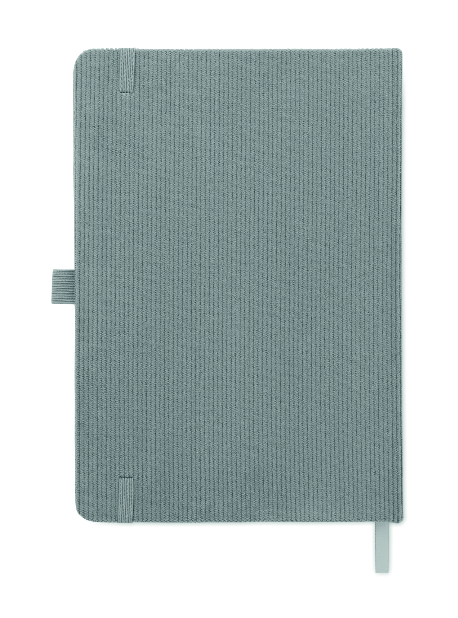 A5-anteckningsbok med hårt RPET-polyesterpärm i manchester och 192 linjerade sidor av återvunnet papper (70 gr/m2). Bunden med elastisk band, pennögla, sidmarkörsband och tagg i tvättat kraftpapper.