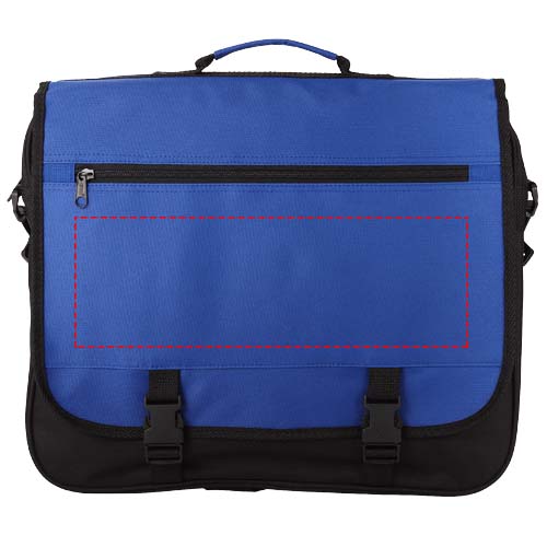 Konferensväska med justerbar axelrem och lock som stängs med spänne. Huvudfack med blixtlås och flera öppna fack under locket som även har en ficka med blixtlås.
