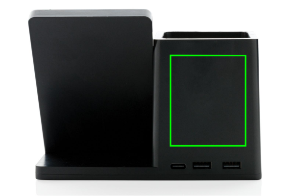 10W trådlös snabbladdare med pennhållare tillverkad av RCS (Recycled Claim Standard) certifierad återvunnen ABS. Totalt återvunnet innehåll: 78% baserat på total produktvikt. RCS certifiering säkerställer en helt certifierad leveranskedja av de återvunna materialen. Den trådlösa laddningsytan är i FSC 100 bambu. Med två USB portar på baksidan för laddning via kabel. Trådlös laddning kompatibel med senaste generationen Android, iPhone 8 och upp. Produkt och accessoarer är PVC-fria. 120cm lång type C laddningskabel i RCS certifierad återvunnen TPE medföljer. Levereras i FSC mix kraft förpackning. Type-C Input 5V/2A; 9V/2A; trådlös output 5V/1A;9V/1.1A; (10W) Registrerad design®