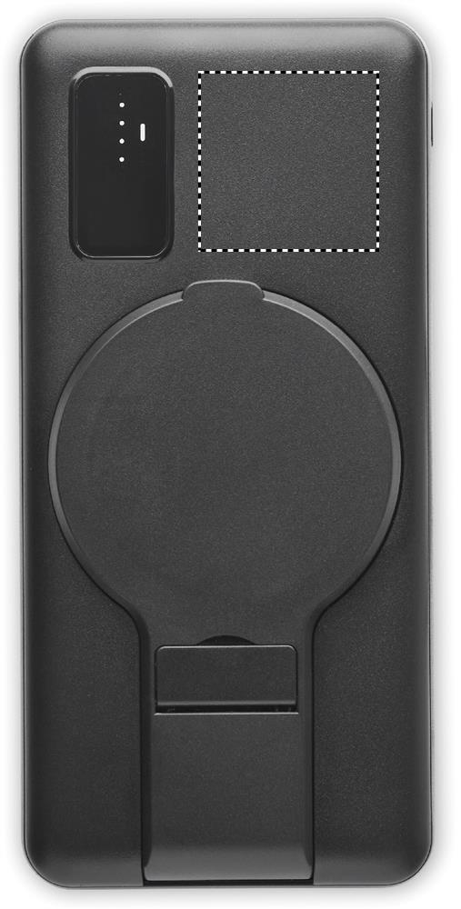 Magnetisk trådlös laddare (15 W) och powerbank (10000 mAh) i ABS med magnetisk telefonstativ. Ingång: micro B, typ-C. Utgång 2x USB-A In/Outgång: Typ-C. Utgång: Utgång: DC 9V/1,66A (15W) idealisk för snabbladdning. Kompatibel med iPhone® 12 och nyare. Inklusive extra magnetisk metallring för att stödja laddning av andra icke-magnetiska trådlöst laddningsbara telefoner.