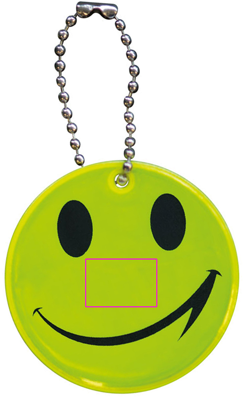 Ett leende för mer säkerhet! Dina små kunder kommer att vara perfekt sedda och säkra med detta reflekterande PVC-hänge, som de kan fästa på väskan, jackan, cykeln, etc. På grund av dess roliga ansikte kommer den troligen att användas av alla. Vi kommer att trycka din logotyp centrerad på framsidan, under ögonen. Enkelpackad i polypåse.
