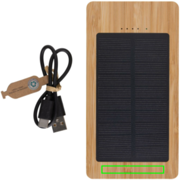 10.000mAh solcellspowerbank tillverkad av FSC 100% bambu. Powerbanken använder monokristallina solpaneler av hög kvalitet med 19% omvandlingsgrad. Laddningshastigheten beror på förhållandena. Powerbanken innehåller ett långvarigt 10.000 mAh litiumbatteri av kvalitet A. Laddningshastighet sol: 5V/180mA. Input type C: 5V/2A. Output: USB A: 5V/2A Type C: 5V/2A. Produkt och tillbehör är PVC-fria. Laddningskabel i RCS-certifierad återvunnen TPE medföljer. Levereras i FSC®-mixförpackning.