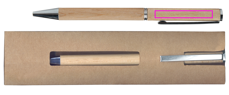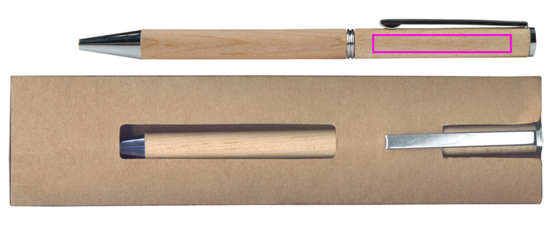 Klassisk träpenna med blåskrivande plastpåfyllning och pappfodral. Vi graverar din logotyp under klämman.